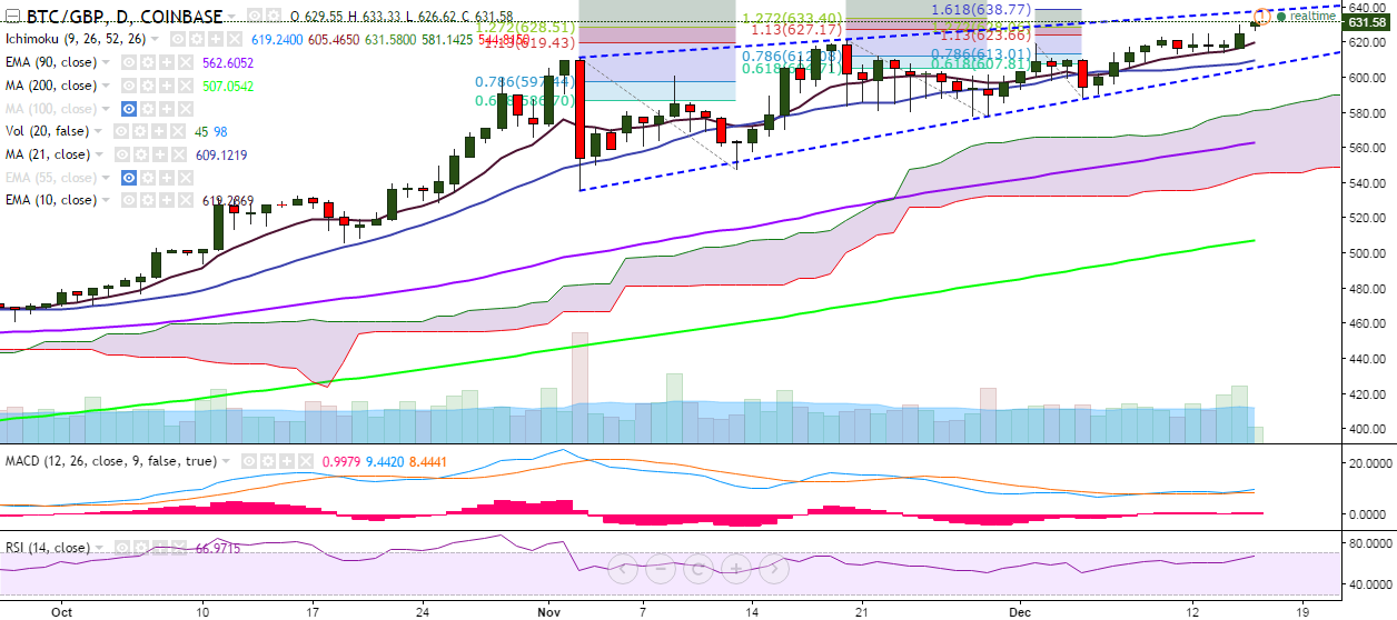 BTC/GBP hit a fresh high of 633.33 levels on Friday and is currently trading slightly lower at 631 levels at the time of writing (Coinbase).