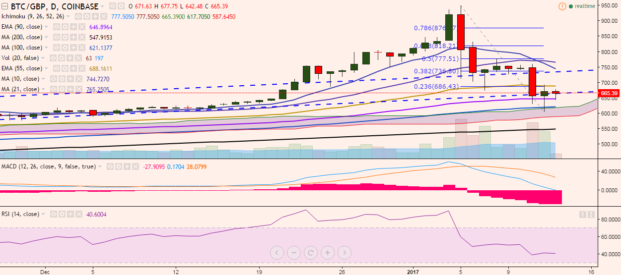 BTC/GBP dropped to a low of 605 levels on Thursday, but has recovered its strength to 661 levels, where it currently trades (Coinbase).
