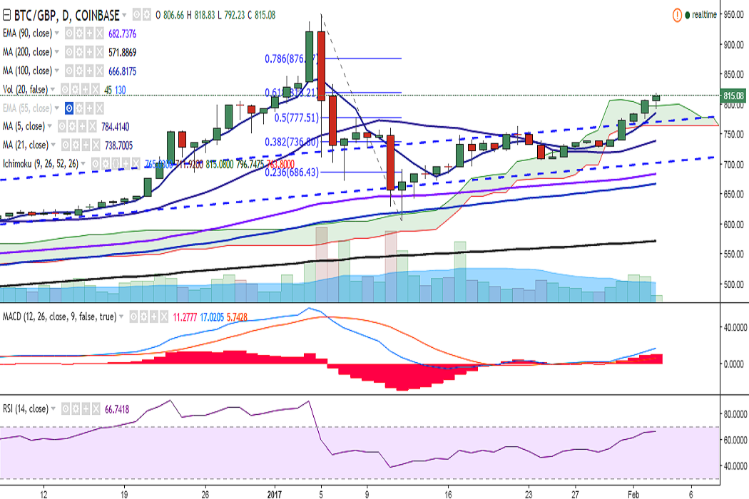 BTC/GBP is gradually moving north and has hit a high of 818 levels so far in the day. It is currently trading at 815 levels (Coinbase).