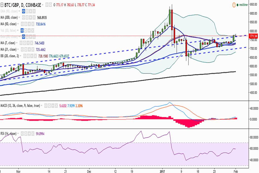 BTC/GBP broke above major trend line resistance at 765 on Tuesday and has hit a high of 782.63 levels so far in the day. It is currently trading at 771 levels at press time (Coinbase).
