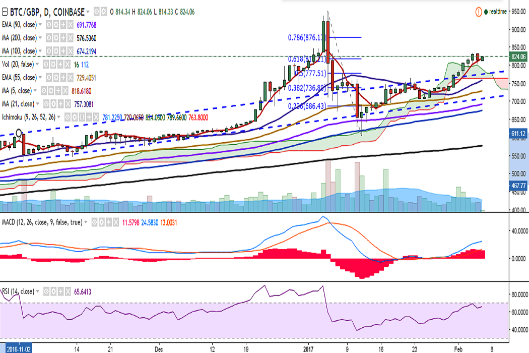 BTC/GBP hit a high of 835 levels on February 04 but reverted from that level. It is currently trying to hold above 5-DMA and is trading at 823 levels at press time (Coinbase).