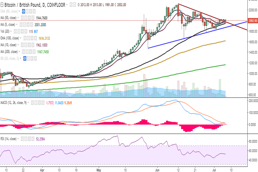 BTC/GBP continues trading in an extremely narrow range seen from the past couple of sessions. It is currently trading at 1999 levels at the time of writing (Coinfloor).