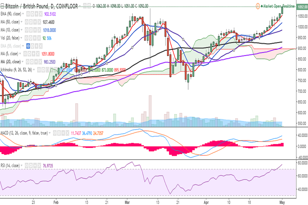 BTC/GBP hit an all-time high at 1098 levels on Monday and is currently trading at 1092 levels at the time of writing (Coinfloor).