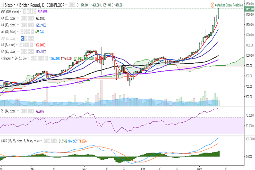 BTC/GBP continued its upward move on Thursday and hit a fresh all-time high at 1461 levels. It is currently trading at 1448 levels at press time (Coinfloor).