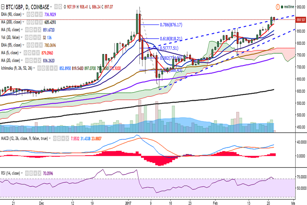 BTC/GBP broke above the 900 mark on Tuesday, but failed to hold its strength and slipped back below today. It is currently trading at 895 levels at press time (Coinbase).