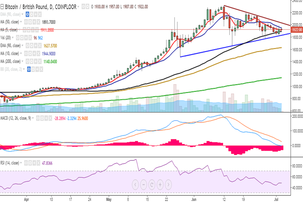 BTC/GBP continues trading in a choppy range on Monday as it continues in a symmetric triangle pattern. It is currently trading at 1923 levels at the time of writing (Coinfloor).