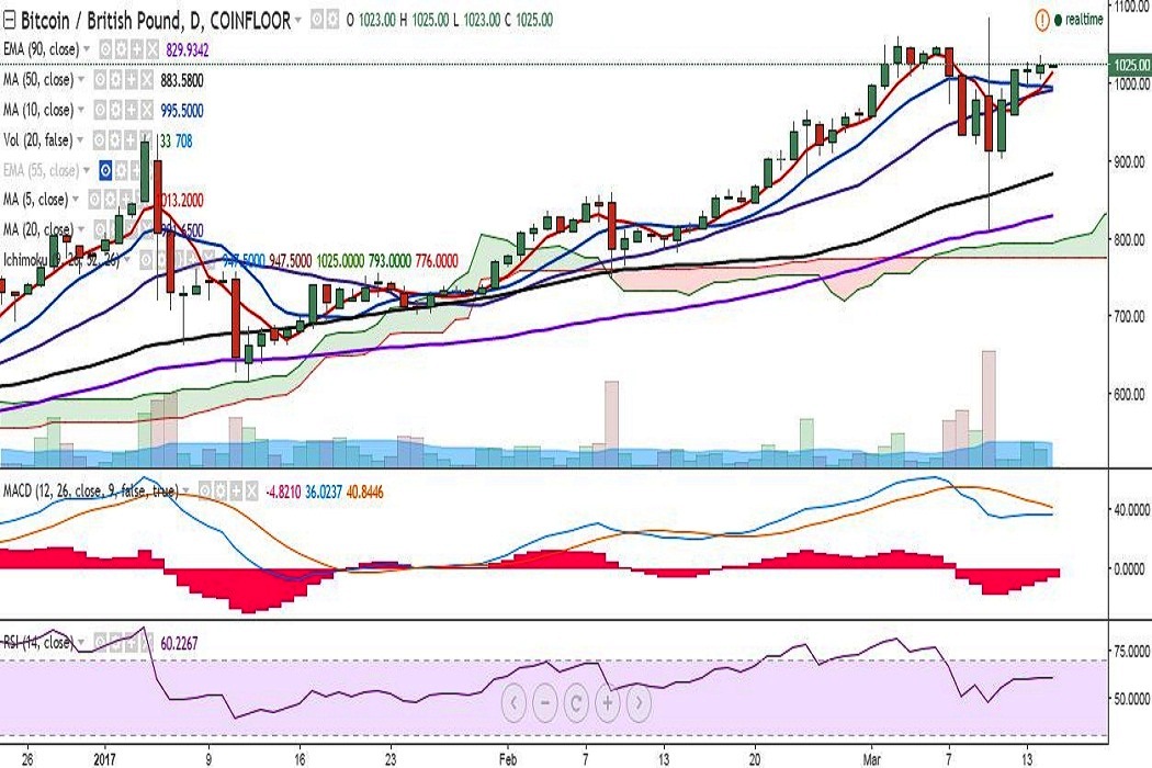 BTC/GBP remained largely unchanged on Wednesday and is hovering around 127.2% retracement of 936 and 616 at 1023 levels (Coinfloor).