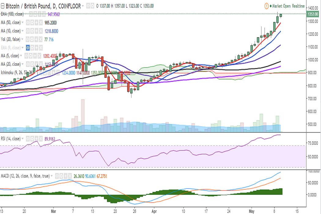 BTC/GBP is holding above 1300 mark on Wednesday and currently trading at 1351 levels at the time of writing (Coinfloor).