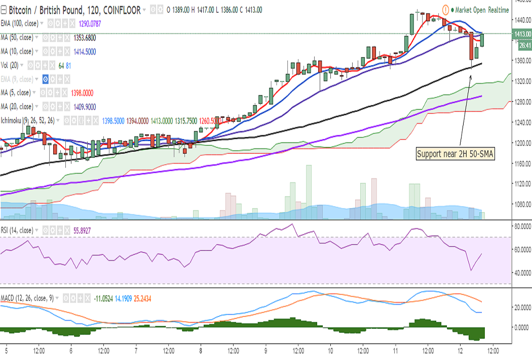 BTC/GBP dropped to 1344 levels on Friday before restoring its strength to above 1400 levels. It is currently trading at 1414 levels at the time of writing (Coinfloor).