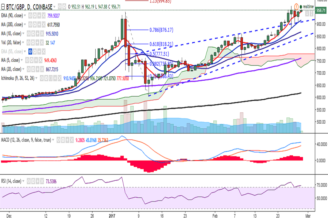 BTC/GBP is trying to hold its strength above 5-DMA and is currently trading at 956 levels at press time (Coinbase).