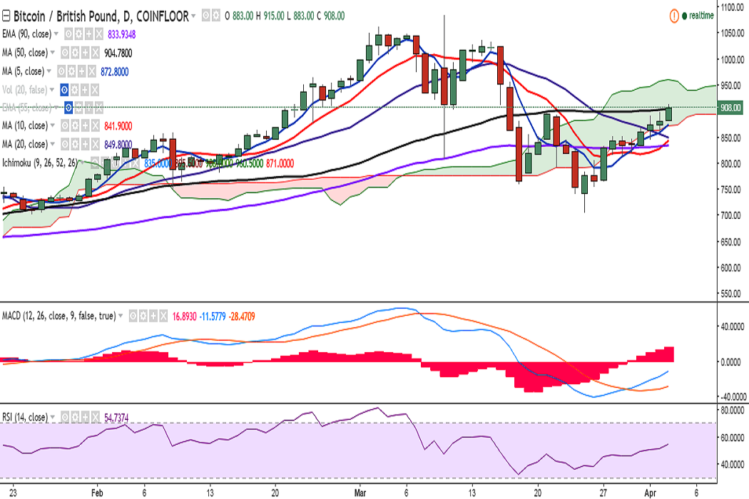 BTC/GBP is continuing its uptrend from the last few days on Monday and is currently hovering around 50-DMA at 908 levels at press time (Coinfloor).