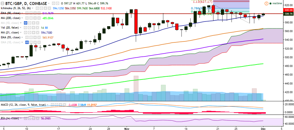 BTC/GBP is hovering around 600 at the time of writing and looking for a consistent break above this level (Coinbase).