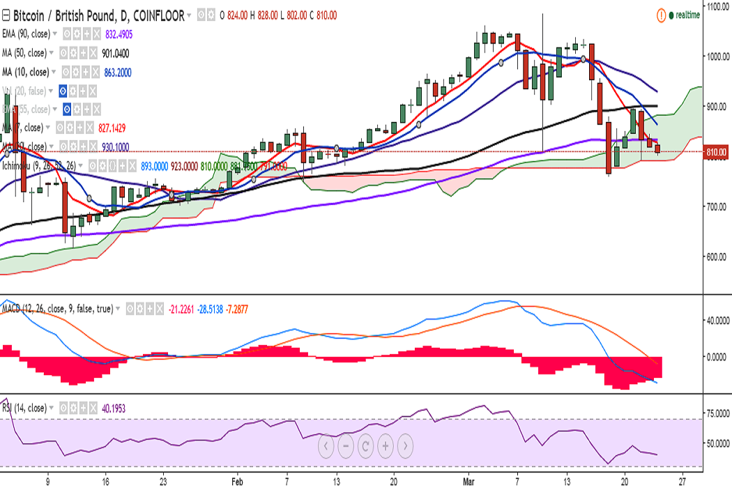 BTC/GBP continues to trade in the red below 90-EMA at 802 levels at the time of writing (Coinfloor).