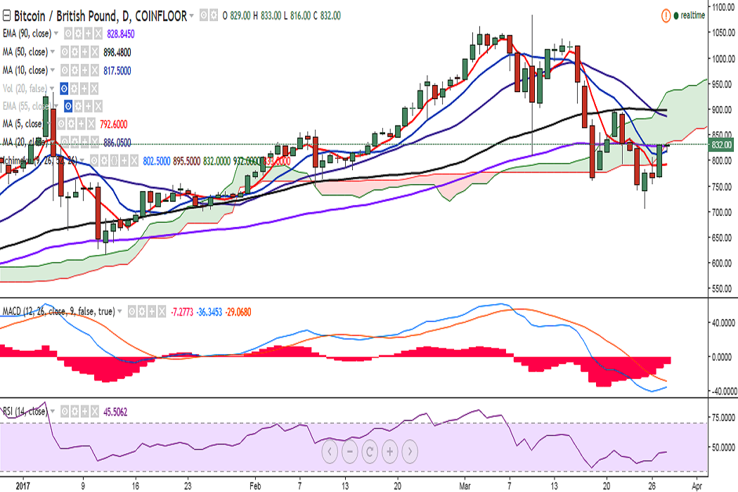BTC/GBP is trading in a very tight range, between 816 and 833 levels, after it hit 834 levels on Monday. It is currently trading at 830 levels at the time of writing (Coinfloor).
