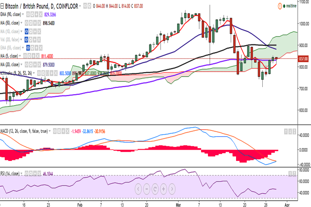 BTC/GBP dropped to 814 levels initially on Wednesday, but turned around and has formed a hammer. It is currently trading at 838 levels (Cloud base) at the time of writing (Coinfloor).