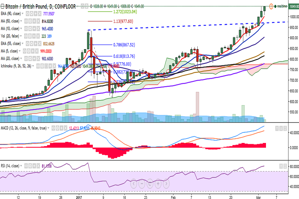 BTC/GBP hit a fresh all-time high of 1050 levels on Thursday and is currently hovering around this level at the time of writing (Coinfloor).