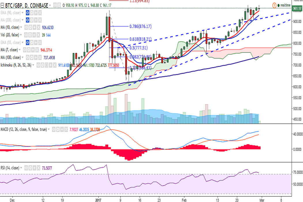 BTC/GBP is trading rangebound on Tuesday. It slightly broke above the previous high of 975 levels, hitting 975.11 levels, but failed to hold its strength. It is currently trading at 960 levels at press time (Coinbase).