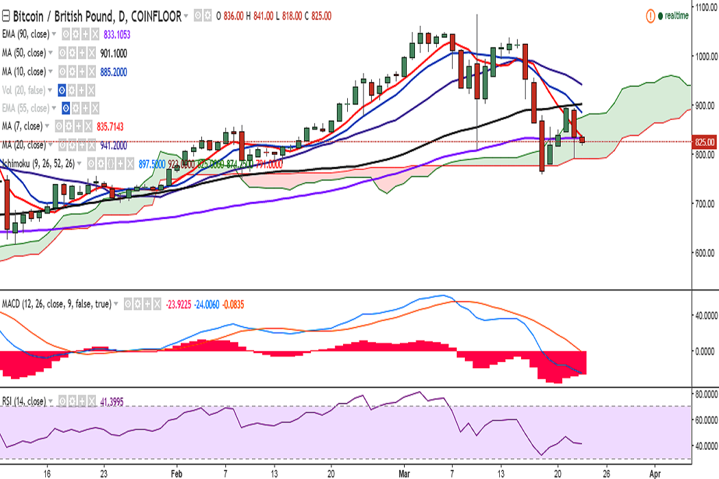 BTC/GBP broke below the 800 mark on Wednesday and fell to 793 levels, before it closed at 836 levels. It is currently trading in a narrow range between 818 and 841 levels at press time (Coinfloor).