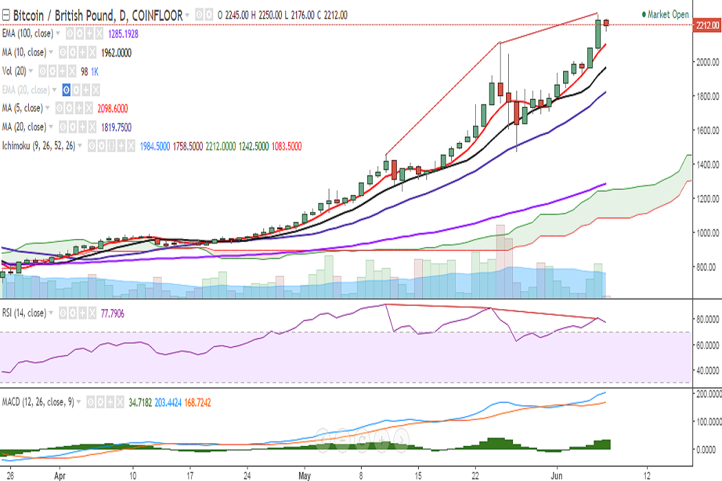 BTC/GBP in trading in a narrow range on Wednesday after it a fresh all-time high at 2277 levels on June 06. It is currently trading at 2212 levels at press time (Coinfloor).