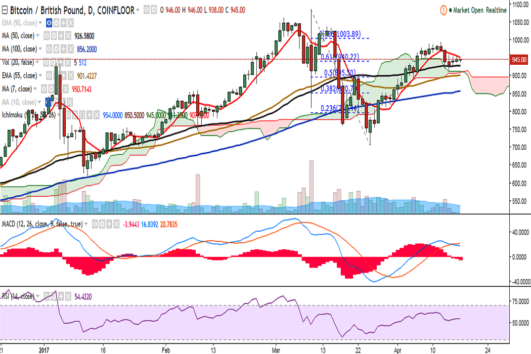 BTC/GBP is trading in a close range between 938 and 946 levels on Monday. It is currently trading at 945 levels at the time of writing (Coinfloor).