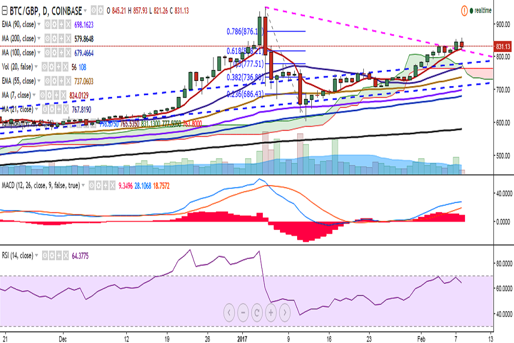 The pair is showing a slight dip after hitting 857 levels. The dip comes as recent reports state that the People’s Bank of China is holding a meeting with domestic bitcoin exchanges, raising concerns over tightening of regulations on bitcoin trading in the country.