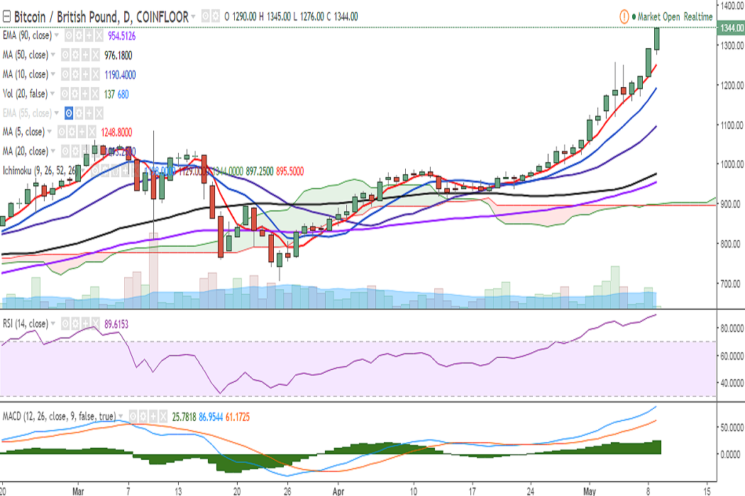 BTC/GBP broke above 1300 levels on Tuesday and is currently trading at 1344 levels at the time of writing (Coinfloor).