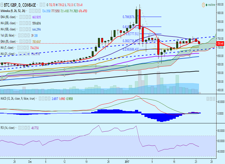 BTC/GBP fell to a low of 712.33 levels on Tuesday before restoring its strength to 734 levels, where it currently trades (Coinbase).