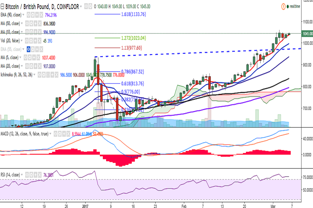 BTC/GBP hit a fresh all-time high of 1062 levels on 03 March 2017 and is currently trying to hold its strength above 5-DMA. It is trading at 1045 levels at the time of writing (Coinfloor).