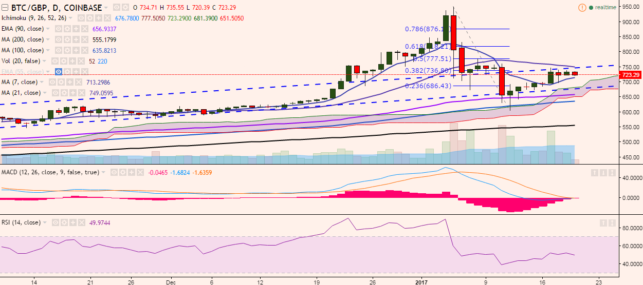 BTC/GBP continues to trade below the major trend line resistance at 722 levels at the time of writing (Coinbase).