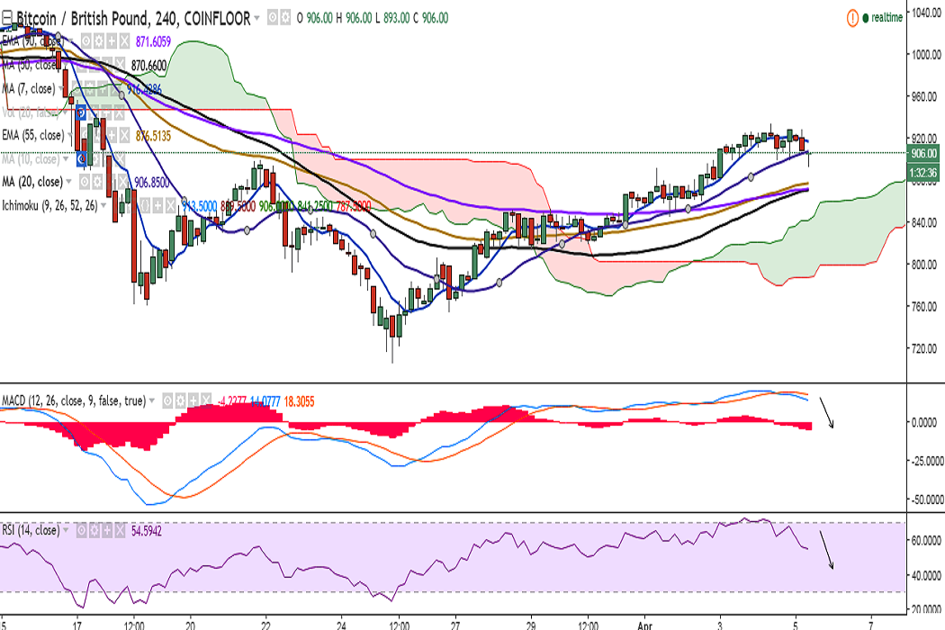 BTC/GBP broke below 50-DMA on Wednesday and is trading in the red around 900 levels at press time (Coinfloor).