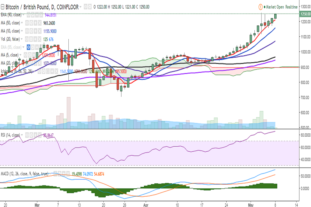 BTC/GBP is trading higher on Monday and hovering around 1250 levels at the time of writing (Coinfloor).