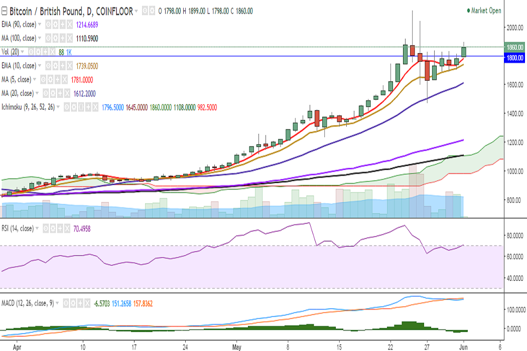 BTC/GBP broke above the 1800 mark on Thursday and jumped till 1899 levels so far in the day. It is currently trading at 1860 levels at press time (Coinfloor).