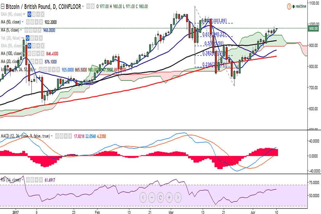 BTC/GBP is trading in a very tight range on Monday between 971 and 980 levels. It is currently trading at 978 levels at press time (Coinfloor).