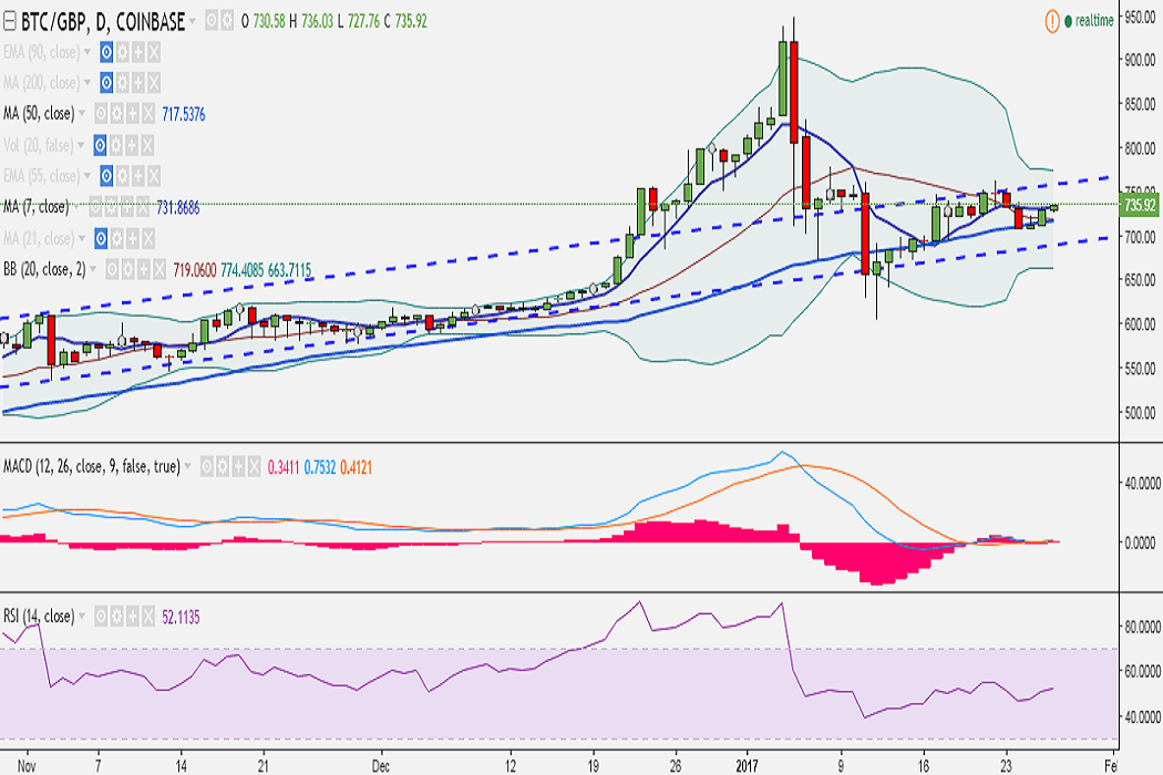 BTC/GBP broke above 21-DMA and is now hovering around 7-DMA at 734 levels at the time of writing (Coinbase).