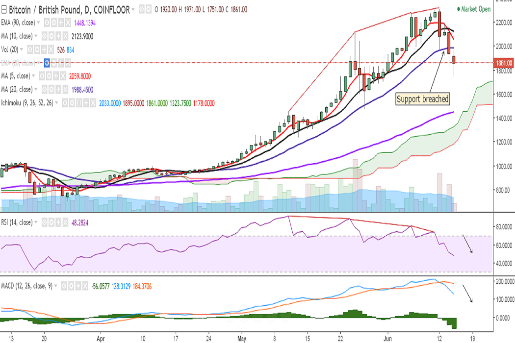 BTC/GBP broke below 20-DMA on Wednesday and continued its downtrend today as well, dropping to 1751 levels. It is currently trading at 1861 levels at the time of writing (Coinfloor).
