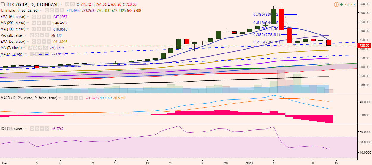 BTC/GBP is trying to hold its strength above the 700-mark. It has hit a low of 699.20 levels so far in the day and is currently trading at 720 levels (Coinbase).