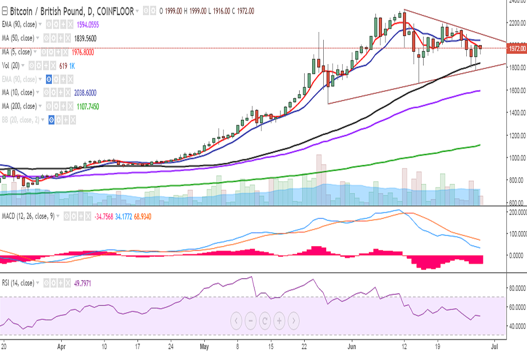 BTC/GBP closed in the green on Tuesday after it dropped to 1777 levels. It is currently trading at 1971 levels at the time of writing (Coinfloor).