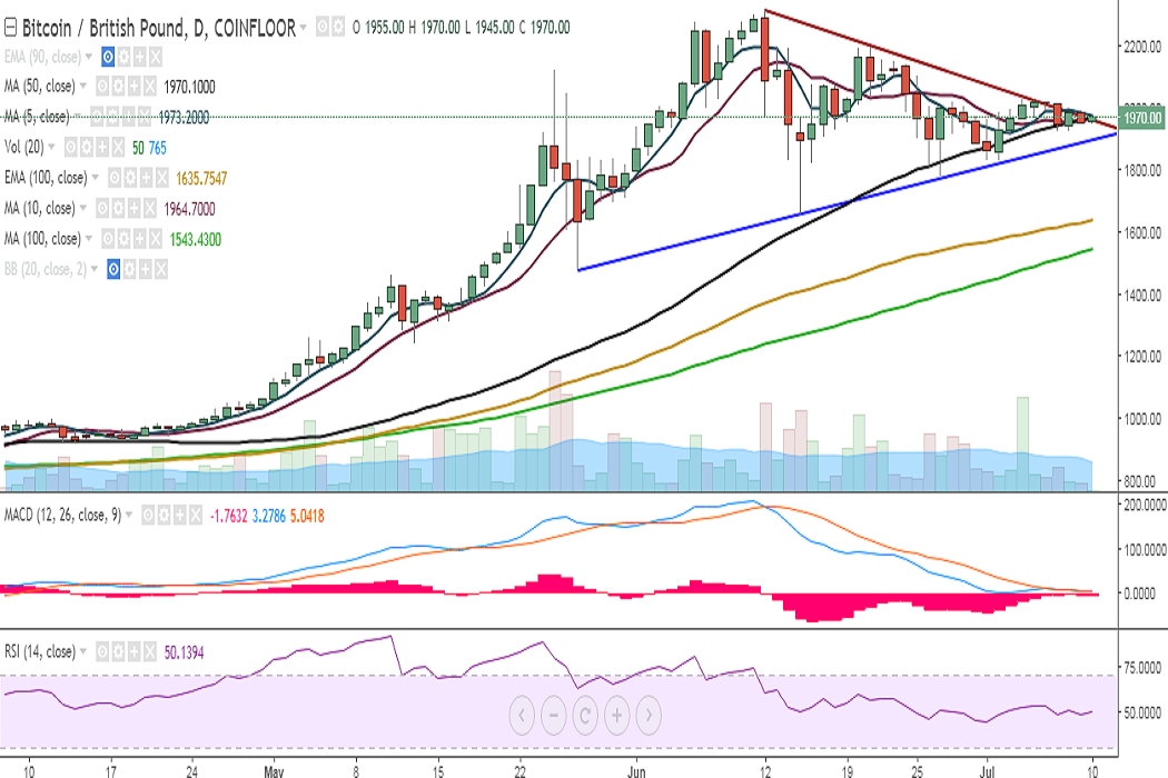 BTC/GBP continues trading in an extremely narrow range on Monday as seen from the past couple of sessions. It is currently trading at 1970 levels at the time of writing (Coinfloor).