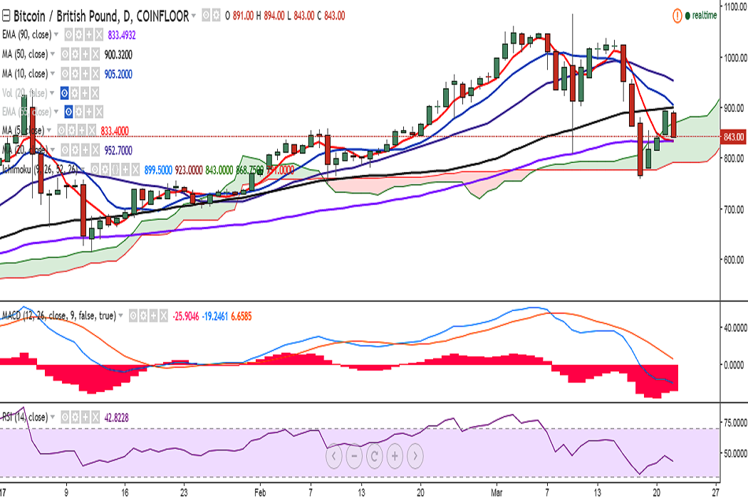 BTC/GBP on Tuesday hit 899 levels but failed to break above. Currently, the pair is trading in the red at 843 levels at press time (Coinfloor).