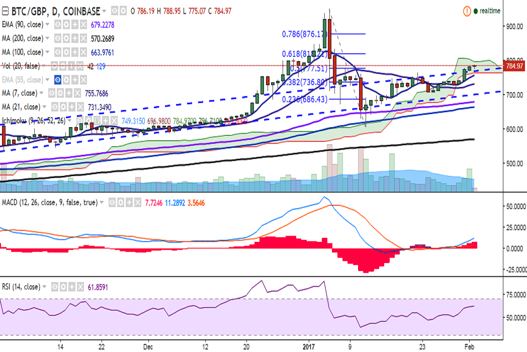 BTC/GBP has hit a high of 778.95 levels so far in the day and is currently trading at 785 levels at press time (Coinbase).