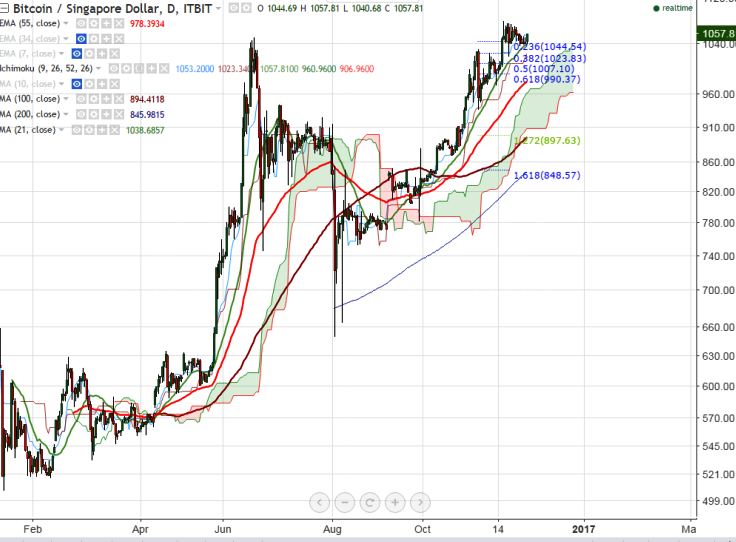 BTC/SGD is seen trading slightly above on Wednesday. The pair has jumped slightly after declining till 1042.50 yesterday (ITBIT). It is currently trading around 10 58.68 at the time of writing.