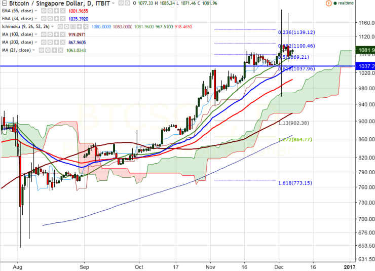 Long-term trend remains to be bullish. BTC/SGD downside is capped by 61.8% retracement of 936 and 1200 level at 1038 any close below that level confirms minor weakness.