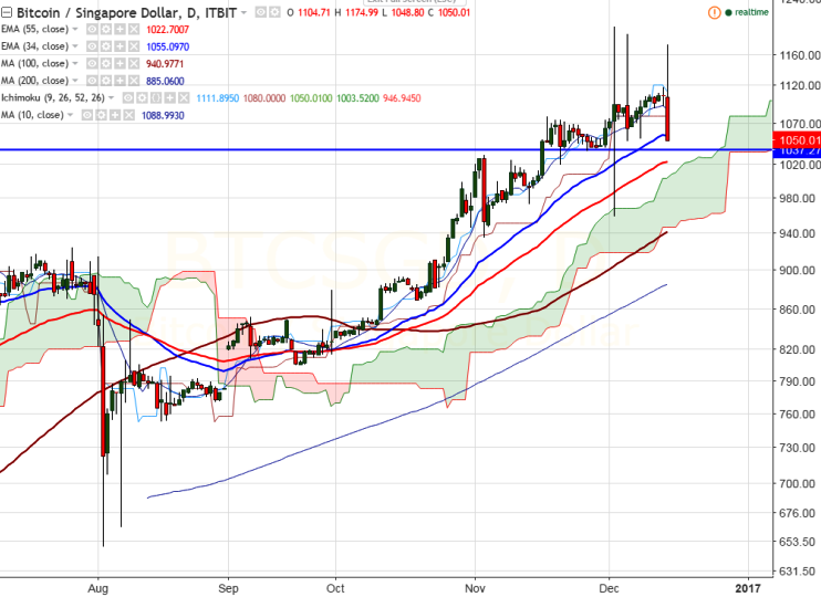 BTC/SGD is seen trading well above on Wednesday. The pair has once again declined sharply after jumping till 1174 (ITBIT). It is currently trading around 1163.97 at the time of writing.