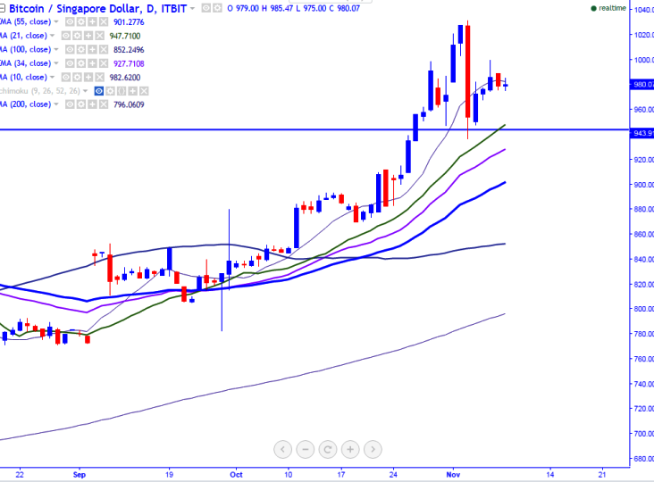 BTC/SGD pair has slightly declined after jumping till 999 on Nov 6th, 2016 (ITBIT). It is currently trading around 976.31 at the time of writing.