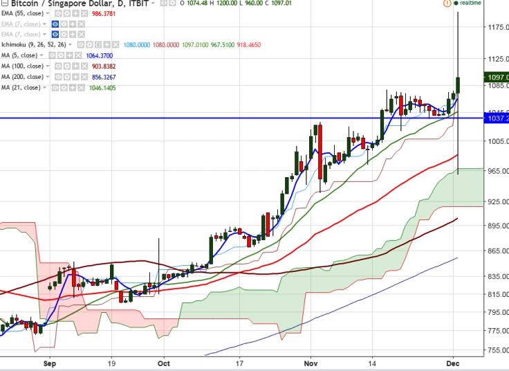 BTC/SGD pair has broken major resistance 1080 and spiked suddenly from that level (ITBIT). It is currently trading around 1097 at the time of writing.