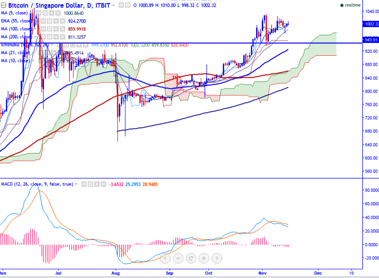 BTC/SGD is seen trading slightly above on Tuesday. The pair has made a low of 973 on Nov 13th, 2016 and slightly jumped from that level (ITBIT). It is currently trading around 1002.32 at the time of writing.