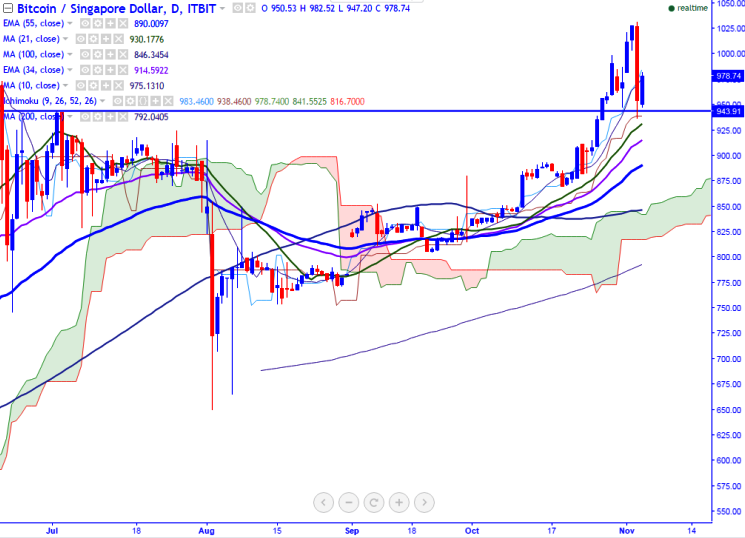 Long-term trend remains to be bullish. BTC/SGD takes support near 21- day MA. So a minor weakness is possible only below the 925 (21- day MA).