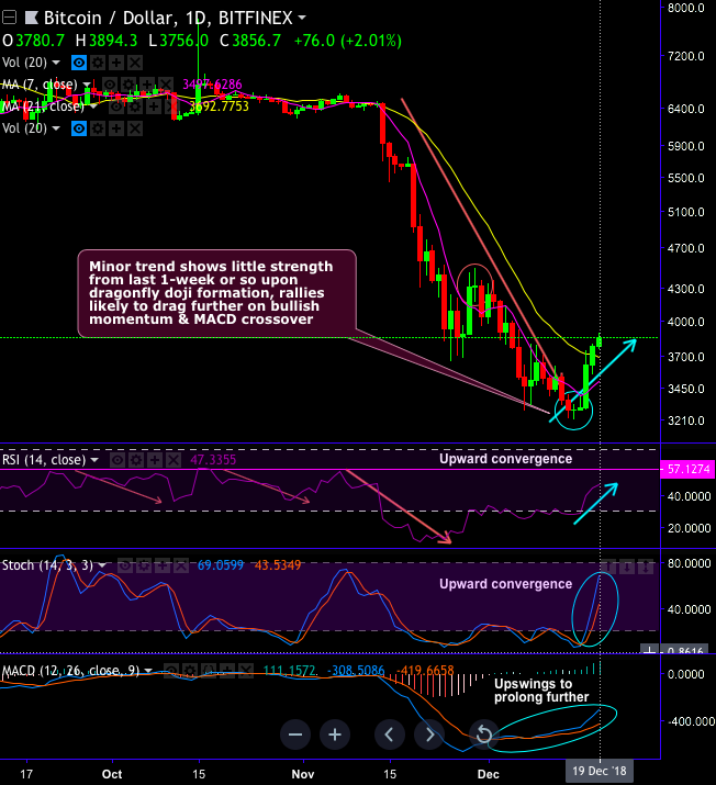 Technical Chart and Candlestick Patterns: BTCUSD forms dragonfly doji at $3,283.4 levels which is bullish pattern, consequently, this bullish pattern candlestick spikes the current prices above DMAs with bullish MACD crossover on daily terms. The minor trend shows little strength from last 1-week or so upon dragonfly doji formation.