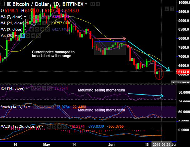 It is now stuck in the range between $6,259 and $5,755 levels from last two three days but more bearish potential for the day is foreseen.
