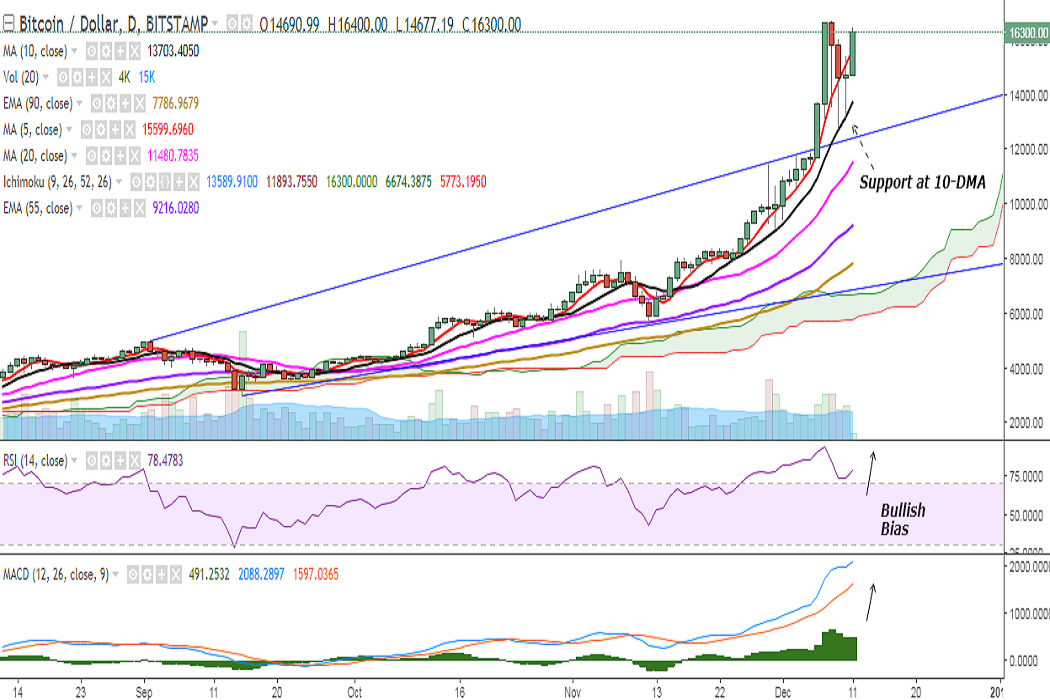 On the reverse side, support is seen at 15280 (1h 10-SMA) and any violation would drag it to 14945 (4h 20-SMA)/14740 (7-DMA). Further weakness would see it testing 14448 (2h 20-SMA)/13683 (10-DMA)/12701 (December 9 low)/12403 (trend line joining 4979.90 and 11800.01).